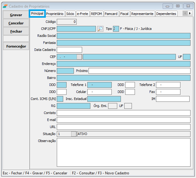 Aba Principal: Tipo; CPF; Razão Social; CEP; Endereço; Número; Bairro; Telefone 1; Telefone 2; Celular; RG.