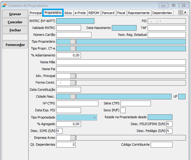 Aba proprietário: RNTRC; Data Nascimento, Tipo proprietário, Cidade Nasc.; Tipo Propriedade e Reside na propriedade desde.