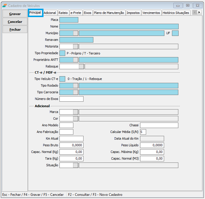 Aba principal: Placa; Nome; Municio; Renavam; Tipo Propriedade e Proprietário Veic.