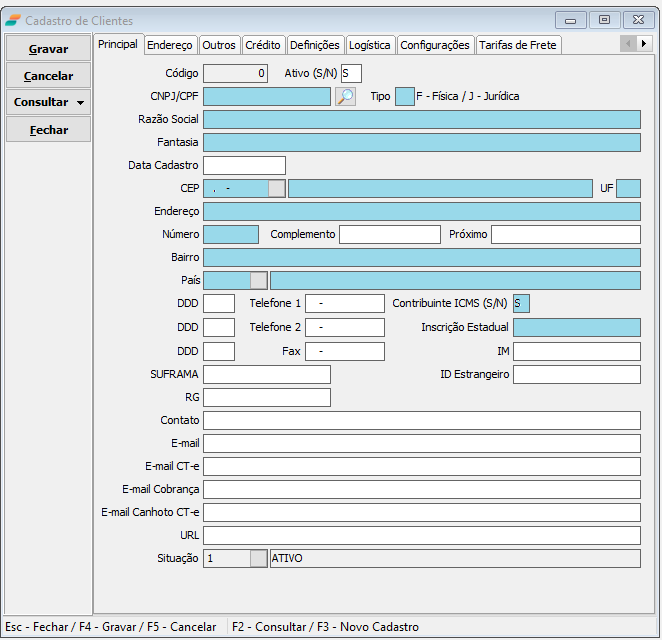 Aba principal: Razão social; Fantasia; Data de nascimento; Endereço; Número; Bairro; Número de telefone; CNPJ ou CPF ; IE ou RG.