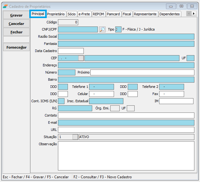 Cadastro de proprietários Menu de acesso: Cadastros/Frotas/Proprietários/Proprietários
