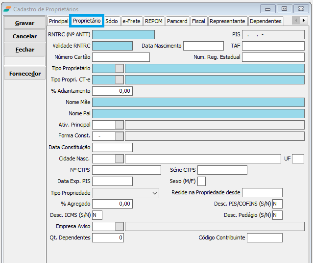Aba proprietário: Quando o tipo de Proprietário for TAC -Transportador Autônomo de Carga-, os campos na aba "Proprietário", deverão ser preenchidos da seguinte forma: